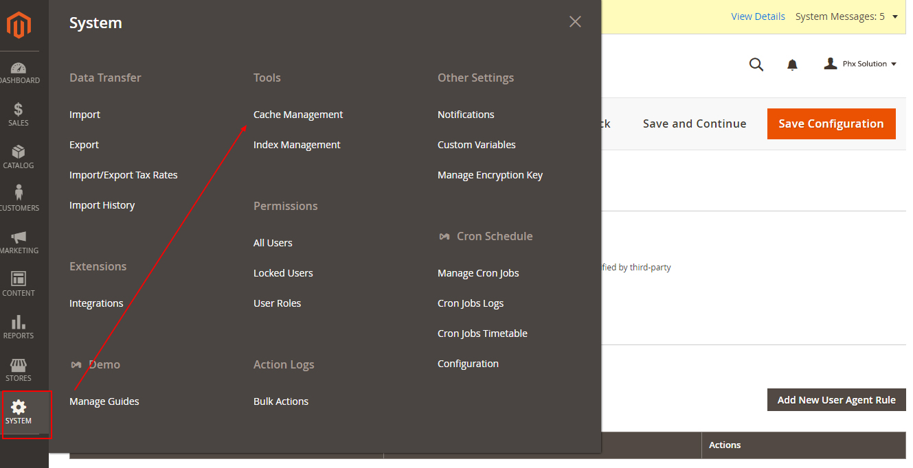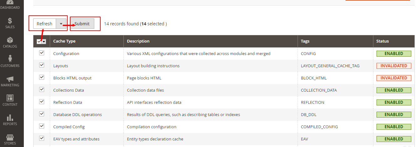 2. Select all caches, then choose `Refresh` from the dropdown and click `Submit`.