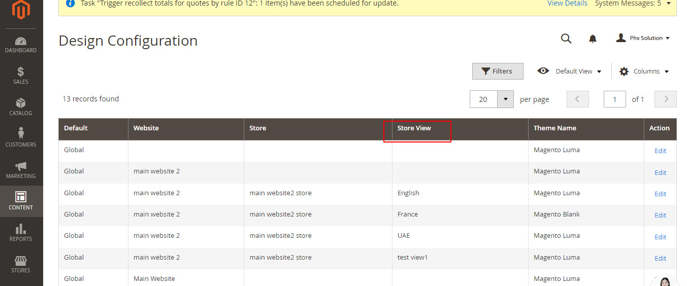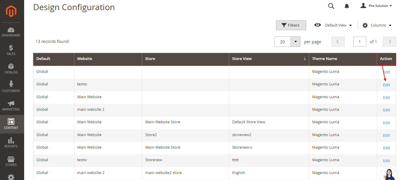 1. You will see a list of available store views. Find the store view you want to change the theme for and click `Edit` in the `Action` column.